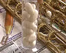 Many research works have focused on the genetics of silkworms and the possibility of genetic engineering. Many hundreds of strains are maintained, and over 400 Mendelian mutations have been described.[9] Another source suggests 1,000 inbred domesticated strains are kept worldwide.[10] One useful development for the silk industry is silkworms that can feed on food other than mulberry leaves, including an artificial diet.[9] Research on the genome also raises the possibility of genetically engineering silkworms to produce proteins, including pharmacological drugs, in the place of silk proteins. Bombyx mori females are also one of the few organisms with homologous chromosomes held together only by the synaptonemal complex (and not crossovers) during meiosis.[11]