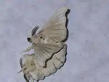 The moth – the adult phase of the lifecycle – is not capable of functional flight, in contrast to the wild B. mandarina and other Bombyx species, whose males fly to meet females and for evasion from predators. Some may emerge with the ability to lift off and stay airborne, but sustained flight cannot be achieved. This is because their bodies are too big and heavy for their small wings. Silk moths have a wingspan of 3–5 cm (1.2–2.0 in) and a white, hairy body. Females are about two to three times bulkier than males (for they are carrying many eggs), but are similarly colored. Adult Bombycidae have reduced mouthparts and do not feed.