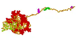Secondary structure prediction and hydrophobicity analyses suggest that the primary sequence of BSP has an open, flexible structure with the potential to form regions of α-helix and some β-sheet.[11] However, the majority of studies have demonstrated that BSP has no α-helical or β-sheet structure by 1D NMR[10][12] and circular dichroism.[13] Analysis of native protein by electron microscopy confirm that the protein has an extended structure approximately 40 nm in length.[14] This flexible conformation suggests that the protein has few structural domains, however it has been suggested that there may be several spatially segmented functional domains including a hydrophobic collagen-binding domain (rattus norvegicus residues 36-57),[15] a hydroxyapatite-nucleating region of contiguous glutamic acid residues (rattus norvegicus residues 78-85, 155-164)[13] and a classical integrin-binding motif (RGD) near the C-terminal (rattus norvegicus residues 288-291).