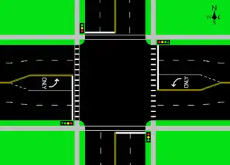 As Kainen (1990) described, a book embedding may be used to describe the phases of a traffic signal at a controlled intersection. At an intersection, the incoming and outgoing lanes of traffic (including the ends of pedestrian crosswalks and bicycle lanes as well as lanes for motor vehicles) may be represented as the vertices of a graph, placed on the spine of a book embedding in their clockwise order around the junction. The paths through the intersection taken by traffic to get from an incoming lane to an outgoing lane may be represented as the edges of an undirected graph. For instance, this graph might have an edge from an incoming to an outgoing lane of traffic that both belong to the same segment of road, representing a U-turn from that segment back to that segment, only if U-turns are allowed at the junction. For a given subset of these edges, the subset represents a collection of paths that can all be traversed without interference from each other if and only if the subset does not include any pair of edges that would cross if the two edges were placed in a single page of a book embedding. Thus, a book embedding of this graph describes a partition of the paths into non-interfering subsets, and the book thickness of this graph (with its fixed embedding on the spine) gives the minimum number of distinct phases needed for a signalling schedule that includes all possible traffic paths through the junction.[51]