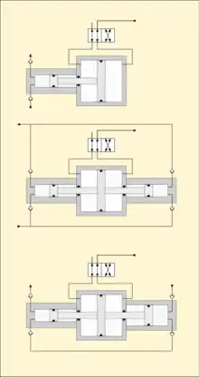 A common arrangement for low pressure air powered boosters is for the booster pistons to be direct coupled with the drive piston, on the same centreline. The low pressure cylinder has a considerably larger section area than the high pressure cylinders, in proportion to the pressure ratio between the drive and boosted gas. A single action booster of this type has a boost cylinder on one end of the power cylinder, and a double action booster has a boost cylinder on each end of the power cylinder, and the piston rod has a drive piston in the middle and a booster piston on each end.[1]