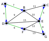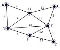 {A,B,C,D,E,F,G} | In the second and final iteration, the minimum weight edge out of each of the two remaining components is added. These happen to be the same edge. One component remains and we are done. The edge BD is not considered because both endpoints are in the same component. |