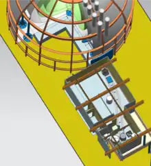 ![]() Borexino from the North side of LNGS's underground Hall C in September 2015. It is shown close to being completely covered in thermal insulation (seen as a silvery wrapping), providing a relatively cost-effective way to further improve its unprecedented radiopurity levels. | |