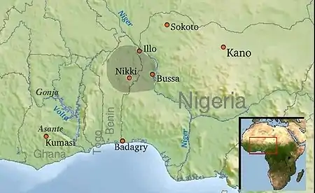 In spite of their separation by the colonial border there are still many exchanges between the petty kingdoms of Borgu situated in Benin and Nigeria. The three major kingdoms are Bussa, Illo and Nikki. Bussa is traditionally considered to be the spiritual centre of Borgu, Nikki the centre of political power and Illo the commercial emporium.[3]