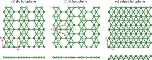 Borophene is a crystalline atomic monolayer of boron, i.e., it is a two-dimensional allotrope of boron and also known as boron sheet. First predicted by theory in the mid-1990s,[1] different borophene structures were experimentally confirmed in 2015.[2][3]