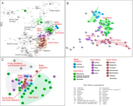 In addition, mtDNA studies shows that the Bosnian population partly share similarities with other Southern European populations (especially with mtDNA haplogroups such as pre-HV (today known as mtDNA haplogroup R0), HV2 and U1), but are for the mostly featured by a huge combination of mtDNA subclusters that indicates a consanguinity with Central and Eastern Europeans, such as modern German, West Slavic, East Slavic and Finnic populations. There is especially the observed similarity between Bosnian, Russian and Finnish samples (with mtDNA subclusters such as U5b1, Z, H-16354, H-16263, U5b-16192-16311 and U5a-16114A). The huge differentiation between Bosnian and Slovene samples of mtDNA subclusters that are also observed in Central and Eastern Europe, may suggests a broader genetic heterogeneity among the Slavs that settled the Western Balkans during the early Middle Ages.[77] The 2019 study of ethnic groups of Tuzla Canton of Bosnia and Herzegovina (Bosniaks, Croats and Serbs) found "close gene similarity among maternal gene pools of the ethnic groups of Tuzla Canton", which is "suggesting similar effects of the paternal and maternal gene flows on genetic structure of the three main ethnic groups of modern Bosnia and Herzegovina".[78]