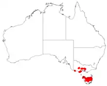 Wiry bossiaea grows in open forest, often in moist places and occurs between Portland and Healesville in southern Victoria and in the north and east of Tasmania..[2][3][8]