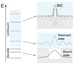 BICs are observed in electronic, photonic, acoustic systems. Bound states in the forbidden zone, where there are no finite solutions at infinity, are widely known (atoms, quantum dots, defects in semiconductors). For solutions in a continuum that are associated with this continuum, resonant states[1] are known, which decay (lose energy) over time. They can be excited, for example, by an incident wave with the same energy. The bound states in the continuum have real energy eigenvalues and therefore do not interact with the states of the continuous spectrum and cannot decay.[2]