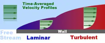 The viscous nature of airflow reduces the local velocities on a surface and is responsible for skin friction. The layer of air over the wing's surface that is slowed down or stopped by viscosity, is the boundary layer. There are two different types of boundary layer flow: laminar and turbulent.[1]
