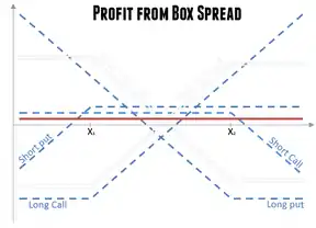 In options trading, a box spread is a combination of positions that has a certain (i.e., riskless) payoff, considered to be simply "delta neutral interest rate position". For example, a bull spread constructed from calls (e.g., long a 50 call, short a 60 call) combined with a bear spread constructed from puts (e.g., long a 60 put, short a 50 put) has a constant payoff of the difference in exercise prices (e.g. 10) assuming that the underlying stock does not go ex-dividend before the expiration of the options. If the underlying asset has a dividend of X, then the settled value of the box will be 10 + x.[1] Under the no-arbitrage assumption, the net premium paid out to acquire this position should be equal to the present value of the payoff.