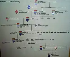 Edward Grey's son Sir John Grey of Groby married Elizabeth Woodville, who after John's death married King Edward IV. Their son Thomas Grey, 1st Marquess of Dorset, prepared for building Bradgate House in the late fifteenth century but died before he was able to begin. It was his son Thomas Grey, 2nd Marquess of Dorset, who built Bradgate House, the likely completion date being 1520. There is now some confusion over this completion date however, as an older house has been discovered under the visible walls and findings have suggested that Lady Jane Grey who wasn't born until October 12, 1537 lived in the older house.[13]