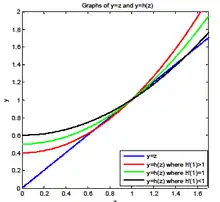 This is also equivalent to finding the intersection point(s) of lines y = z and y = h(z) for z ≥ 0. y = z is a straight line. y = h(z) is an increasing (since ) and convex (since ) function. There are at most two intersection points. Since (1,1) is always an intersect point for the two functions, there only exist three cases:
