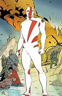 The Infinite Crisis limited series revealed that if the Multiverse had survived up to the present, Zanetti would have been a native of Earth-Eight as its version of Captain Atom.[1] Breach escapes from imprisonment by Alexander Luthor. In issue #7 of the series, he joins a makeshift army of heroes defending Metropolis from the dozens of members of the Secret Society of Supervillains. Breach is seen battling the evil construct Amazo. Soon later, Superboy-Prime ruptures Zanetti's containment suit and apparently kills him. The resulting explosion appears to kill the superheroine Looker and the superhero Technocrat as well, but Looker was later revealed to have survived thanks to her telekinesis. Upon Breach's detonation, Captain Atom materializes in the position where Breach had been.[2]