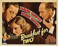 Breakfast for Two is a 1937 American screwball comedy film made by RKO Radio Pictures. It was directed by Alfred Santell. The film stars Barbara Stanwyck, Herbert Marshall and Glenda Farrell. Stanwyck and Marshall worked together once more, immediately following this film, on the 20th-Century-Fox drama Always Goodbye (1938).[1]