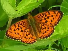 Brenthis ino is a medium-sized butterfly with a wingspan of 34–42 millimetres (1.3–1.7 in). Females are larger and usually darker than males. The antennae are clavate (club shaped). The basic color of the upper side of the wings is orange with several dark brown blotches. The edges are brown too, with a discontinuous stripe of small blotches. The lower side of the wings is creamy orange with an indented edge and dark brown blotches on the forewings, while the hindwings show brown-edged beige blotches and some ringed dark brown and violet shading spots. The wings of this species lacks any silver blotches. The butterfly flies from June to August depending on the location. It overwinters in the form of caterpillar. The larvae feed on meadowsweet (Filipendula ulmaria), dropwort (Filipendula vulgaris), stone bramble (Rubus saxatilis), raspberry (Rubus idaeus), Aruncus species, Spiraea species and salad burnet (Sanguisorba minor).[1]