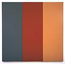 Marden’s early monochromatic paintings exist as single panels, diptychs and triptychs. In each of the four Red Yellow Blue paintings (1974), the artist painted slabs of dense yet nuanced color on three adjoined canvas panels, using oil paint mixed on the spot with melted beeswax and turpentine and applied with a knife and spatula.[10] He gradually increased the number of panels, arranging them into post-and-lintel configurations.[7]