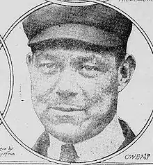 Owens and fellow umpire Will Brennan were hurt during the first game of the August 20, 1912 double-header between the Brooklyn Dodgers and Pittsburgh Pirates at Forbes Field. Owens, who had started the game umpiring first base, had taken over home plate duties after Brennan's season-ending injury (a broken right kneecap and torn ligaments suffered during a fall while running to cover second base) in the first inning. Then, in the second inning, Owens was struck in the chest by a foul ball, tearing several rib ligaments and leaving him with a broken breast bone. His exit marked the first — and so far only — known time that two umpires left the same major league game due to injury.[2] Brennan and Owens were both hospitalized overnight at St. John's hospital.[3]