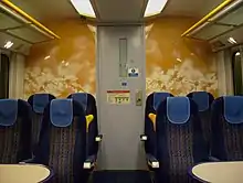 Additional modifications included re-gearing the traction motors to reduce the train's maximum speed from 100 mph (161 km/h) to 75 mph (121 km/h), both to reduce the likelihood of overheating when making frequent stops and starts, and because the higher speed was unnecessary on suburban services in any case.[31] New Train Management System (TMS) software was developed to be compatible across the entire Class 458/5 fleet, simplifying maintenance and improving reliability.[30] An Automatic Selective Door Opening (ASDO) system was installed for use at a small number of stations where it was impractical to lengthen platforms.[33] The vehicle interiors were refurbished and reconfigured to provide more standing room for passengers, mainly by changing from 5- to 4-abreast seating and thus allowing a wider aisle.[33][30] The units were also repainted into SWT's blue livery, matching the Class 450 fleet.