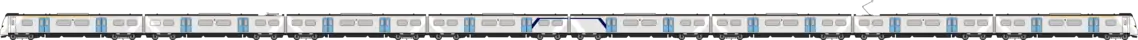 There are 60 eight-car units and 55 twelve-car units.[66] Each is a fixed length continuously gangwayed vehicle.[3] The initial livery is "light grey with pastel blue doors and a white diagonal flash at the carriage ends".[3]