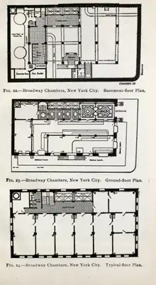 When completed, the Broadway–Chambers Building contained Otis hydraulic elevators.[24][25] The building's plumbing system served 16 communal restrooms, one on each floor above the street, as well as a restroom in the basement and a private restroom for the engineer. As arranged, thirteen of the communal toilets were for men, and three were for women.[26] Building plans indicate that the elevators, as well as a fire stair and the restrooms, are all clustered around a corridor on the north side of the building. A "typical floor" was outfitted with several offices, connected to each other via doors. On the ground floor was an entrance vestibule from Broadway.[27] The ground-floor space was intended for retail, the basement was to be used for a restaurant, and the subbasement housed the building machinery.[24]