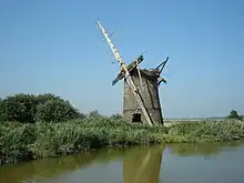 Only two stocks and two stubs of the original sails remain. The mill has a very westward lean to it, inspiring the myth that a furious Devil tried to foil Brograve's drainage efforts by blowing it down.[2] Separated by the Cut, Brograve Mill cannot be directly reached on foot. However, it can be seen very closely from various eastern perspectives by following a path along the Waxham New Cut from Horsey Mere (see illus.), where there is also a farm track on private property owned by Brograve Farm. The only direct access the mill would be by boat along the Waxham New Cut, however entering the structure is strongly discouraged as it is in a very unsafe state.