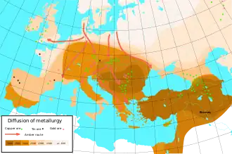 The period is characterized by the widespread use of bronze, even if only by elites in its early part, though the introduction and development of bronze technology were not universally synchronous.[3] Human-made tin bronze technology requires set production techniques. Tin must be mined (mainly as the tin ore cassiterite) and smelted separately, then added to hot copper to make bronze alloy. The Bronze Age was a time of extensive use of metals and of developing trade networks (See Tin sources and trade in ancient times). A 2013 report suggests that the earliest tin-alloy bronze dates to the mid-5th millennium BC in a Vinča culture site in Pločnik (Serbia), although this culture is not conventionally considered part of the Bronze Age.[4] The dating of the foil has been disputed.[5][6]