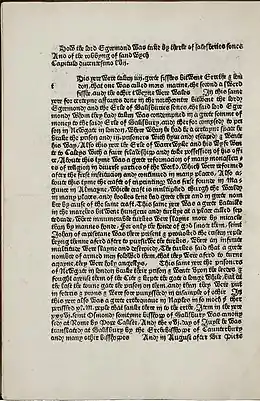 After the "massive scribal activity" that produced over 250 extant manuscripts (a "vast number for a medieval text"[6]), the Brut was the first chronicle printed in England. The Brut was one of William Caxton's first printings, and he may have compiled this version himself.[7] Between 1480, when Caxton printed it as the Chronicles of England, and 1528 it went through thirteen editions. As a result, according to Matheson, "it is no exaggeration to say that in the late Middle Ages in England the Brut was the standard historical account of British and English history".[24]