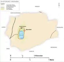 Buada Lagoon, Nauru's only inhabited inland area, with some 660 inhabitants living around it,[4] lies in the centre-west of Buada District. Girded by a road, the lakeshore is made up of private residential properties[1] where fruit trees are grown, such as pandan, breadfruit, banana, mango, guava and soursop, and along with those such vegetables as cabbage and bitter melon.[1][10] These households together form the community of Arenibek.