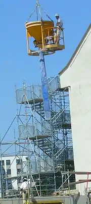 A concrete bucket delivers concrete by means of a tower crane. It has a bottom opening to allow concrete to flow out when in-place. See also tremie.