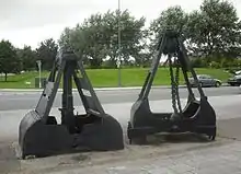 The clamshell bucket is a more sophisticated articulated several-piece device, including two elementary buckets associated on a hinged structure forming a claws-like appendage with an internal volume.