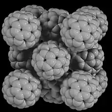 Buckminsterfullerene is a type of fullerene with the formula C60. It has a cage-like fused-ring structure (truncated icosahedron) made of twenty hexagons and twelve pentagons, and resembles a soccer ball. Each of its 60 carbon atoms is bonded to its three neighbors.