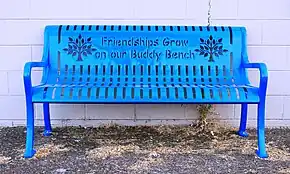 A buddy bench or friendship bench is a seat in a school playground where a child can go when they want someone to talk to.[1] Buddy benches may be distinctively different from other seating in the school and may be specially designed by an artist or with the help of the children themselves. They are sometimes rainbow-colored. Such benches are situated in open and well-traveled areas of the school so that any child using the bench will be noticed quickly.
