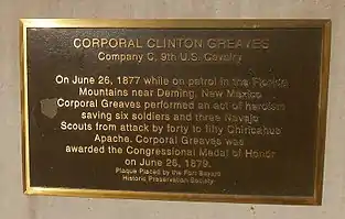 From 1867 to the early 1890s, these regiments served at a variety of posts in the Southwestern United States and the Great Plains regions. They participated in most of the military campaigns in these areas and earned a distinguished record. Thirteen enlisted men and six officers from these four regiments earned the Medal of Honor during the Indian Wars. In addition to the military campaigns, the Buffalo Soldiers served a variety of roles along the frontier, from building roads to escorting the U.S. mail. On April 17, 1875, regimental headquarters for the 10th Cavalry was transferred to Fort Concho, Texas. Companies actually arrived at Fort Concho in May 1873. The 9th Cavalry was headquartered at Fort Union from 1875 to 1881.[11] At various times from 1873 through 1885, Fort Concho housed 9th Cavalry companies A–F, K, and M, 10th Cavalry companies A, D–G, I, L, and M, 24th Infantry companies D–G, and K, and 25th Infantry companies G and K.[12] From 1879 to 1881, portions of all four of the Buffalo Soldier regiments were in New Mexico pursuing Victorio and Nana and their Apache warriors in Victorio's War.[13] The 9th Cavalry spent the winter of 1890 to 1891 guarding the Pine Ridge Reservation during the events of the Ghost Dance War and the Wounded Knee Massacre. Cavalry regiments were also used to remove Sooners from native lands in the late 1880s and early 1890s.