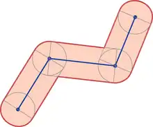- Create a rectangle along each line segment by creating a duplicate line segment offset the distance r perpendicular to each side.