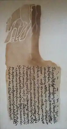 The Bugut inscription (Mongolian: Бугут, romanized: Bugut) is a multi-lingual inscription first discovered in Ikh-Tamir sum of Arkhangai Province, Mongolia. The inscription is dated to 584 CE and was dedicated to Taspar Khagan (reigned 572–581) the fourth Khagan of the Turkic Khaganate. The inscription is in the form of a monumental wolf-crowned stele 198 cm high that sits on a turtle base 47 cm high. The front, right and left side of the stele has a Sogdian inscription written with Sogdian alphabet. The back side has a possibly Ruanruan inscription written with Brahmi script.[1] The original location of the inscription on the west bank of the Bayantsagaan river, a tributary of the North Tamir river, shows evidence of a walled complex. The wall embankment is 59mx30m with an inner moat 4.5m wide and 2m deep. In the center of the walled complex was a temple whose wooden pillars and roof tiles were still visible on the ground. Only a few brick fragments were found. The inscription itself was found within the walls on a square platform 7.5mx7.5m made of layered stones.[2]