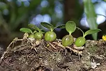 Bulbophyllum nutans is a species of epiphytic orchid native to Madagascar and the Mascarene Islands in the family of Orchidaceae. They form into a cluster, creating a group of green-like bulb appearance that form pseudobulbs with cotyledon-like leaves on top that usually has two leaves. The orchids form an inflorescence of white-golden like flowers that shoot out from beneath the orchid's pseudobulbs.