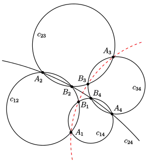 Bundle theorem. If for eight different points five of the six quadruples are concyclic (contained in a cycle) on at least four cycles , then the sixth quadruple is also concyclic.[1]