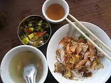 - Shan khauk swé (ရှမ်းခေါက်ဆွဲ [ʃáɴ kʰaʊʔsʰwɛ́]) – rice noodles with chicken or minced pork, onions, garlic, tomatoes, chili, crushed roasted peanuts, young snowpea vine, served with tofu fritters, and pickled mustard greens[49]