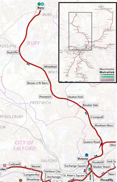 The line runs entirely on an old railway alignment without any street running. It runs north from Manchester Victoria and connects the suburbs of Cheetham Hill, Prestwich, Whitefield and Radcliffe. The entire route from Victoria to Bury is roughly 10 miles (16 km) long. Two services travel along the line, both starting at Bury, and terminating at Altrincham and Piccadilly respectively.