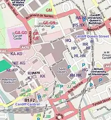 Most city bus services call at other significant bus stops in the centre.[13][14] All city centre bus stops have a two letter code and most are found in clusters.