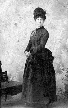 As the fashion for crinolines wore on, their shape changed. Instead of the large bell-like silhouette previously in vogue, they began to flatten out at the front and sides, creating more fullness at the back of the skirts.[4] One type of crinoline, the crinolette, created a shape very similar to the one produced by a bustle. Crinolettes were more restrictive than traditional crinolines, as the flat front and bulk created around the posterior made sitting down more difficult for the wearer.[5] The excess skirt fabric created by this alteration in shape was looped around to the back, again creating increased fullness.