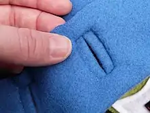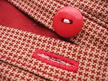 Buttonholes are reinforced holes in fabric that buttons pass through, allowing one piece of fabric to be secured to another. The raw edges of a buttonhole are usually finished with stitching. This may be done either by hand or by a sewing machine. Some forms of button, such as a frog, use a loop of cloth or rope instead of a buttonhole.[1] Buttonholes can also refer to flowers worn in the lapel buttonhole of a coat or jacket, which are referred to simply as "buttonholes" or boutonnières.[2]