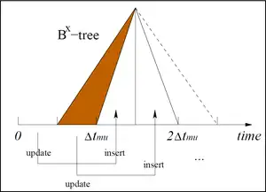 Given a new object, its index key is computed and then the object is inserted into the Bx-tree as in the B+ tree. An update consists of a deletion followed by an insertion. An auxiliary structure is employed to keep the latest key of each index so that an object can be deleted by searching for the key. The indexing key is computed before affecting the tree. In this way, the Bx-tree directly inherits the good properties of the B+ tree, and achieves efficient update performance.