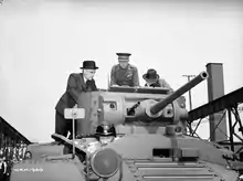 In 1933, the Liberal Party was in opposition and considered Howe as a potential candidate for the House of Commons in the upcoming election. Howe, feeling political activism was bad for business, had not publicly expressed political views.[22] Norman Platt Lambert, a Liberal Party official and friend of Howe, brought him to a meeting with Liberal Party leader William Lyon Mackenzie King on 20 January 1934. The two men were impressed with each other and, according to Lambert in his diary, Howe wanted a guaranteed Cabinet position were he to run in the new riding of Port Arthur.[23] Mackenzie King accepted this deal[24] and on 14 October 1935, Howe was comfortably elected to the Commons from Port Arthur, amassing a majority of 3,784. Across the country, the Liberals won a landslide victory, with 173 seats in the House of Commons to the Conservatives's 40.[24][25] Mackenzie King appointed Howe to two portfolios: Minister of Railways and Canals and the first Minister of Marine. Howe was the only engineer in Cabinet, which was dominated by lawyers,[26] and was the first engineer to serve in a Liberal government.[27][lower-alpha 1]