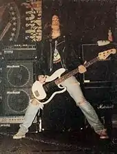 Ward replaced original band member Dee Dee Ramone, though Dee Dee continued to write songs for the band. Ward went to the audition with the sole purpose of jamming with the Ramones; he was not "nervous or intimidated" as he had no intention of getting the job but much to his surprise, he did. After being discharged from the Marines and learning 40 Ramones songs in five weeks, Ward played his first live show with the band on September 30, 1989.[5] Adjusting to the Ramones' play style was one of the biggest challenges he had, as Ward was originally a finger-playing bassist as opposed to Dee Dee's signature downpicking technique. He eventually learned to adapt by lowering his bass down to his kneecap and wearing sweatbands.[6]