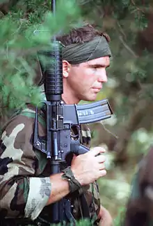 In the early 1980s, at the request of the United States Marine Corps,[11] Colt upgraded the M16A1 rifle, resulting in the M16A2 rifle. Among the major changes were a reinforced lower receiver, a case deflector, a birdcage flash suppressor redesigned to be a muzzle brake, and a barrel with a faster 1-in-7 twist. The faster barrel was necessitated by the switch from the 55-grain M193 bullet to the 62-grain M855 bullet. The M16A2 rifle's barrel was also thicker for the portion in front of the handguard. Colt incorporated these changes into its carbines, which it called M16A2 carbines. The Model 723 M16A2 carbine used the iron sights of the M16A1, but had a case deflector. The barrel had a 1-in-7 twist, but the thinner profile of the older M16A1 carbine's barrel. As with the Model 653, the United States military made small purchases of the Model 723 for its special operation forces.[12] It was notably used by Delta Force operators from the late 1980s to the early 1990s.[13]