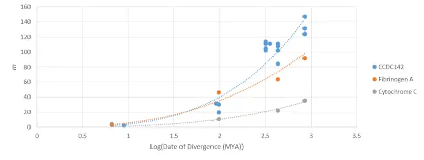 CCDC142 is closely related in mammals, mollusks and amphibians, reptiles and birds, and in fish.[5] The CCDC142 gene goes as far back as Drosophila melanogaster, which split from the human lineage 847 million years ago. CCDC142 has mutated at a greater rate than both Cytochrome C (a highly conserved protein) and Fibrinogen A (a rapidly mutating protein). This indicates that CCDC142 is a rapidly mutating gene with an increasing rate of mutation (that is, evolution) over time.