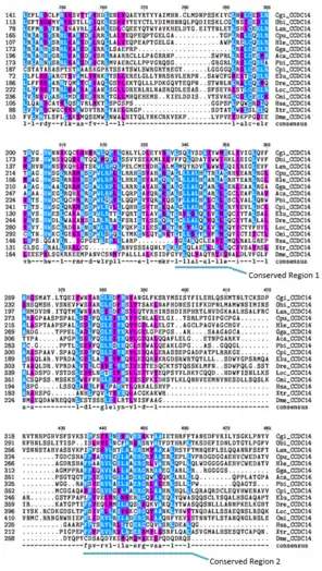 In the Multiple Sequence Alignment above (created using the CLUSTALW and TEXSHADE programs at SDSC Biology Workbench), organisms are labeled by the first letter of their genus and the first two letters of their species. The whole CCDC142 protein is highly conserved in mammals.[5] The regions containing the Homo sapiens coiled-coil domain and the RINT1_TIP1 motif region are highly conserved in distant homologs.[5] 12 of the 15 amino acids that match across all organisms in this region are nonpolar.[5] Conserved Region 1 contains mostly nonpolar amino acids.[5] Conserved Region 2 contains mostly nonpolar and basic amino acids. Conserved Region 3 contains both polar and nonpolar amino acids.[5] Conserved Region 5 contains mostly nonpolar and basic amino acids.[5]