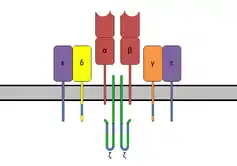 The T cell receptor complex with TCR-α and TCR-β chains (top), ζ-chain (CD247) accessory molecules (bottom) and CD3 (represented by CD3γ, CD3δ and two CD3ε).