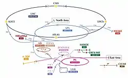 - The 28 GeV Proton Synchrotron (PS), built during 1954—1959 and still operating as a feeder to the more powerful SPS and to many of CERN's experiments.[53]